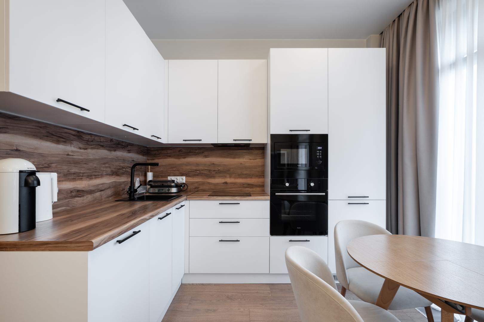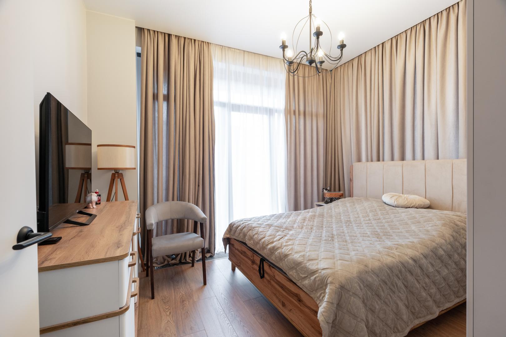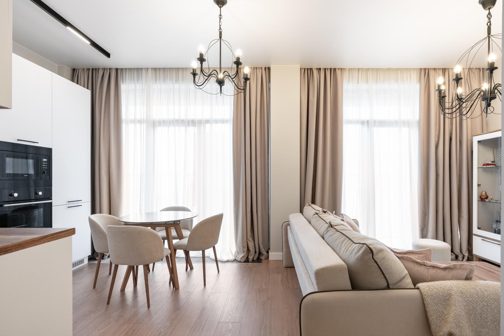 В отделке апартаментов использованы только современные, высококачественные и экологичные материалы. Апартаменты укомплектованы всей необходимой мебелью(изготовленной под заказ) и техникой ведущих производителей для комфортного проживания(много пространства для хранения вещей).