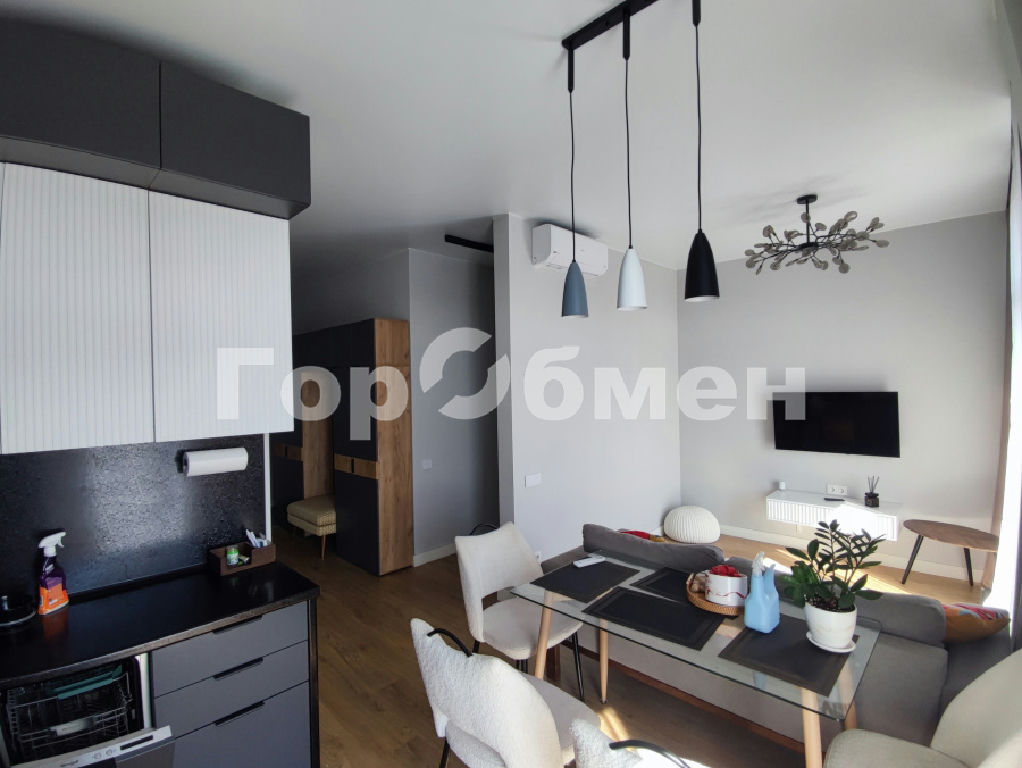 Кухня: встроенный гарнитур, обеденная группа, диван, ЖК-телевизор.